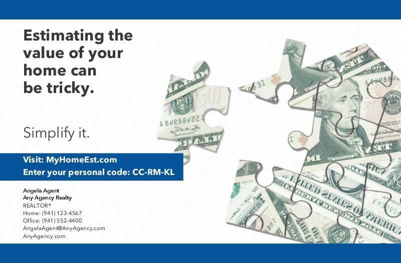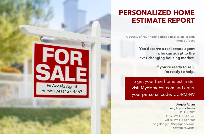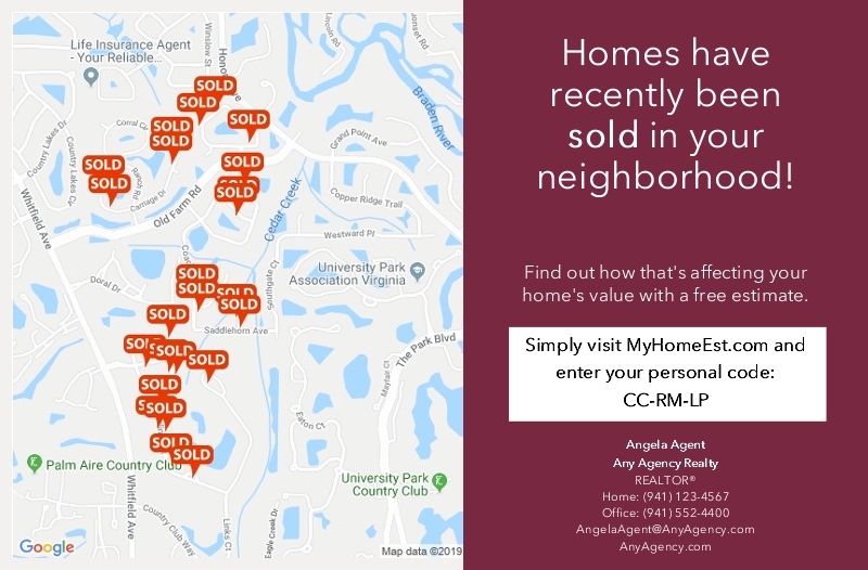 The map is a real-time lead generating Home Value Estimator (HVE) feature, available for free on Target Farming Reports and Postcards. Homeowners are drawn to a map showing their home and various listed and sold homes in the surrounding area. A unique code (or QR code, if selected) is provided for them to access information about the value of their home at MyHomeEst.com. When they visit the website, you instantly receive real-time leads with available homeowner contact information for following up. If you are ordering non-addressed postcards, entering individual names to mail to, or uploading your own list, one unique code will be used for all recipients, and you will not receive a notification. In this case, the recipient will be prompted to enter their address to receive an estimate. In non-disclosure states, an estimate will not be provided; however, it will show the list price trend for the county as well as a list of similar properties that are on the market or have been sold. A call to action will be in place of the estimate, prompting the homeowner to reach out to you as the Local Real Estate Specialist.